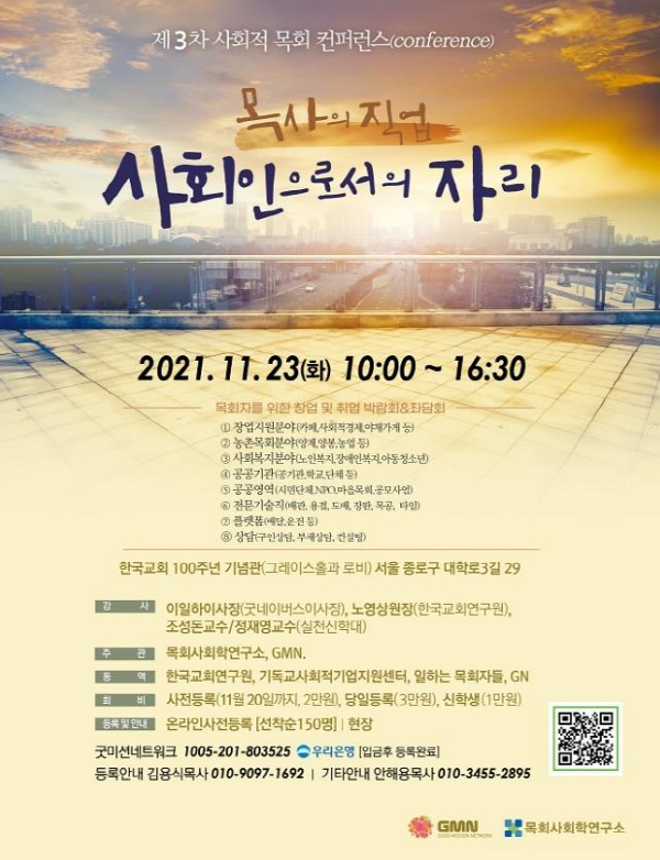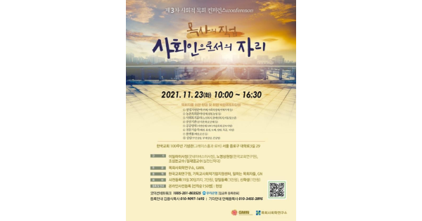 목회사회학연구소(소장 조성돈)와 굿미션네트워크(회장 한기양)가 23일 한국교회100주년기념관에서 ‘목사의 직업, 사회인으로서의 목회’라는 주제로 사회적 목회 컨퍼런스를 개최한다. 이번 컨퍼런스는 한국교회연구원과 마을목회4.0, 기독교사회적기업지원센터, 일하는 목회자들, GN 등이 함께 동역한다.