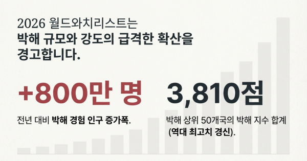 국제 기독교 박해 감시단체 오픈도어가 최근 발표한 '2026 월드와치리스트'에 따르면, 2025년 한 해 동안 박해를 경험한 기독교인 수는 전년 대비 약 800만 명 이상 증가했다. 특히 박해 상위 50개국의 박해 지수 합계는 3,810점을 기록하며 역대 최고치를 경신했으며, 박해 수위가 '극심함' 단계에 해당되는 국가도 상위 15개국까지 확대됐다.