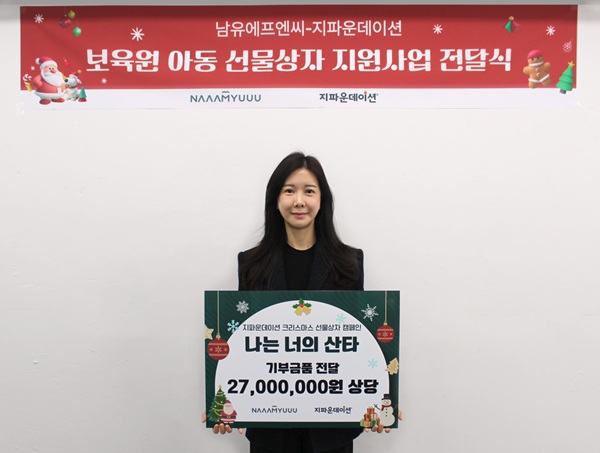 국제개발협력NGO 지파운데이션(대표 박충관)은 ㈜남유에프엔씨(대표 남유숙, 이하 남유네)가 보육원 아동 크리스마스 선물 지원을 위해 2,700만 원 상당의 기부금품을 전달했다고 17일 밝혔다.