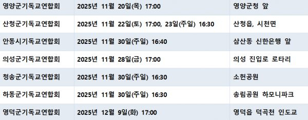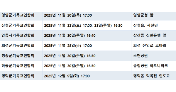 또한 산불로 인하여 전소된 교회들 중 안동 영남북부교회(합신:이영기 목사), 영덕 석동교회(백석: 박경원 목사), 의성 하화교회(통합: 김진웅 목사)에서는 불타버린 교회를 다시 건축하기 위하여 준비 중이며, 건축이 끝났거나, 교회를 이전한 각각의 교회에서 하나님께서 예비하실 새로운 시작과 함께 성탄의 기쁜 소식을 알릴 수 있는 점등식이 준비되고 있다.(대상교회와 점등식 날짜 추후공지)