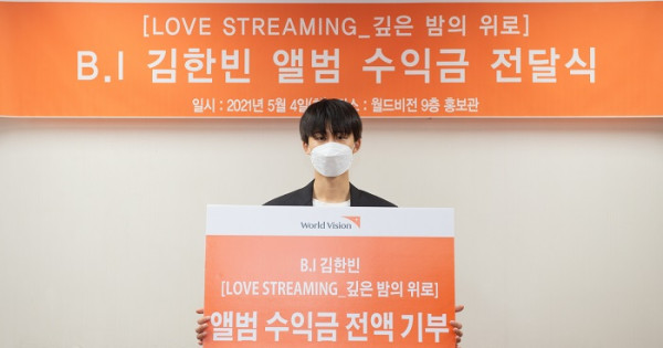 비아이는 지난달 19일 음악이 울려 퍼질수록 세상의 온기가 되는 마음을 전한다는 ‘LOVE STREAMING’ 프로젝트를 기획하고 앨범 ‘깊은 밤의 위로’를 발매했다. 앨범 발매 당시 저작권료, 음원·음반 판매 수익, 콘텐츠 수익 등 전액을 월드비전에 기부하겠다는 계획을 밝힌 바 있다. 이에 4일 월드비전 본부에서 열린 전달식에서 ‘깊은 밤의 위로’ 앨범 판매 수익금 전액을 기부했다.