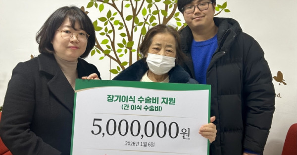 (재)사랑의장기기증운동본부(이하 본부, 이사장 유재수)는 지난 1월 6일, 간이식 수술을 받은 환자 이봉순 씨(66세, 여)에게 수술비 지원금 500만 원을 전달했다고 밝혔다.