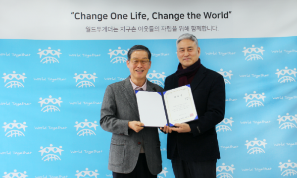▲조형호 홍보대사(왼쪽), 월드투게더 김용우 회장(오른쪽) (사진제공=사단법인 월드투게더)