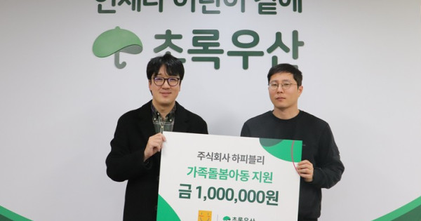 초록우산(대구지역본부장 문희영)은 하피블리(대표이사 이효민)로부터 대구지역 가족돌봄아동 지원을 위한 후원금 100만 원을 전달받았다고 밝혔다.