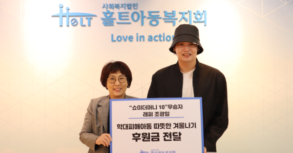 홀트아동복지회(회장 이수연)는 ‘쇼미더머니 10’ 우승 래퍼 조광일이 연말을 맞아 도움이 필요한 학대피해아동을 돕기 위해 후원금을 전달했다고 밝혔다.