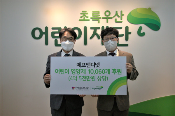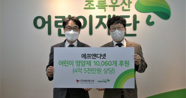 에프앤디넷은 4억 5,000만 원 상당의 어린이 영양제 1만여 개를 취약계층 아동의 성장과 발달을 위해 기부했다. 기부된 영양제는 전국 267개 지역아동센터의 취약계층 아동들에게 전달됐다.