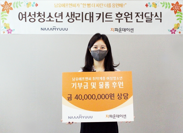 ㈜남유에프엔씨는 2019년부터 정기적으로 지파운데이션을 통해 생리대가 부족해 어려움을 겪고 있는 여성청소년에 후원금과 남유에프엔씨의 자사 브랜드 화장품을 기부하며, 지금까지 기부금 9천만 원과 1억 8천만 원 상당의 화장품 등 물품을 기부했다.