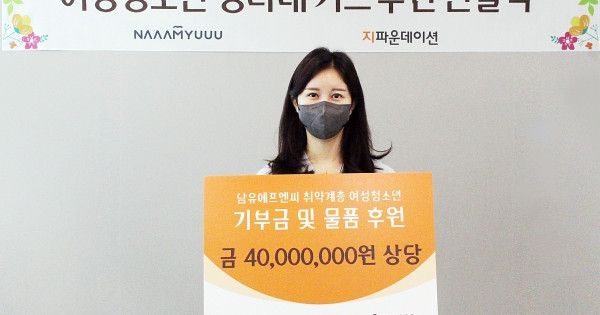 국제개발협력NGO 지파운데이션(대표 박충관)은 (주)남유에프엔씨(대표 남유숙)가 취약계층 여성청소년 200명을 위해 기부금 2천만 원과 자사 화장품인 베리아워 클렌징워터, 아이보들 선로션 및 수딩젤 2천만 원 상당의 물품을 추가 기부했다고 16일 밝혔다.