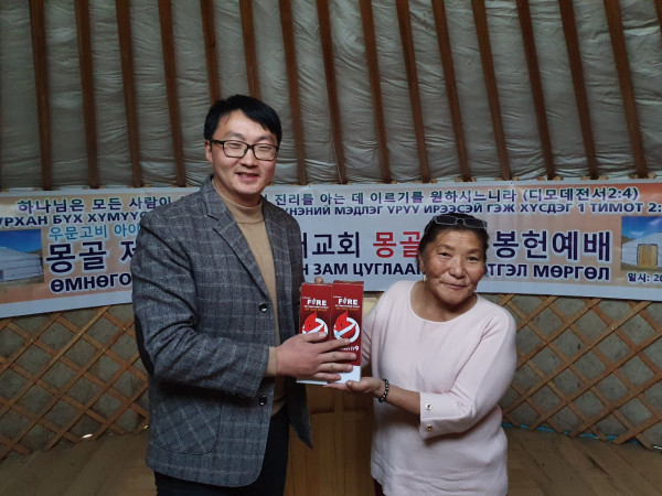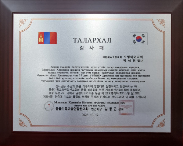 몽기총 김동근 장로는 몽골 복음화를 위한 몽기총의 사역에 적극 동참하여 몽골 제23오병이어교회 게르성전을 건축 후원한 박석영 집사에게 감사패를 전달했다.