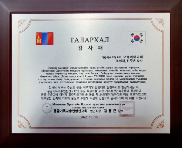 몽기총 김동근 장로는 몽골 복음화를 위한 몽기총의 사역에 적극 동참하여 몽골 제24오병이어교회 게르성전을 건축한 광명오병이어교회 조성재 신주은 집사부부에게 감사패를 전달했다.