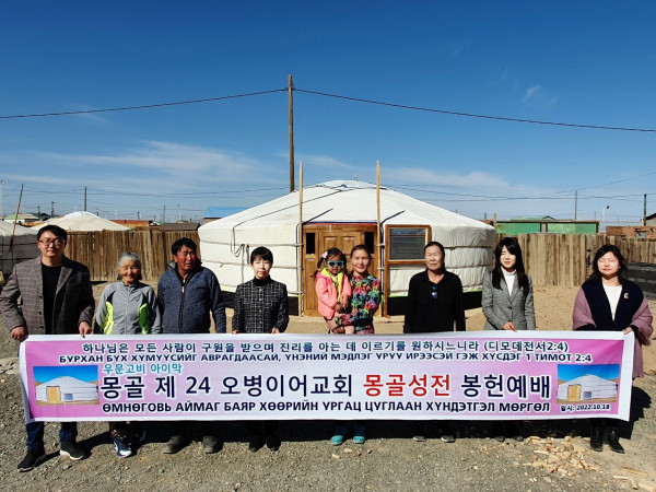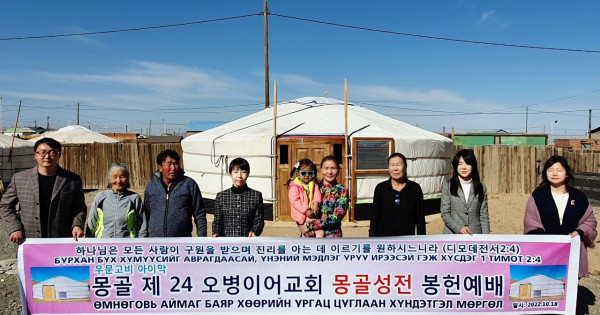 몽골과 중앙아시아를 넘어 세계복음화의 비전으로 오직 말씀에만 순종하며 활동하는 몽골기독교총연합선교회(법인회장 김동근 장로)의 사역에 동참하여 한국 광명오병이어교회(담임 권영구 목사)가 24번째 게르성전을 건축했다.