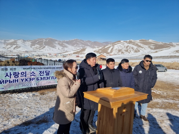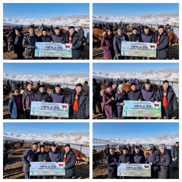 주는 마음과 받는 마음이 예수사랑으로 하나되어 몽골 겨울 추위 속에서도 따뜻하고 훈훈한 시간이었다. 소 한 마리 후원 금액은 한 구좌 60만원으로 교회 및 개인 누구나 동참할 수 있으며, 이후 몽기총 목장에서 후원자별로 이름표가 부착되어 특별 관리, 전달된다.