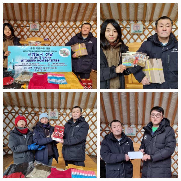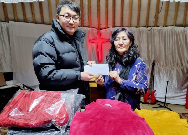 새해를 맞아 몽기총은 예수사랑 이웃섬김의 실천으로 울란바트르시 바양주르흐구 가쪼르트 마을에 가쪼르트 게렐교회 담당 사역자인 체체게 전도사에게 어린이 의류와 방한용품과 함께 후원금을 전달했다.