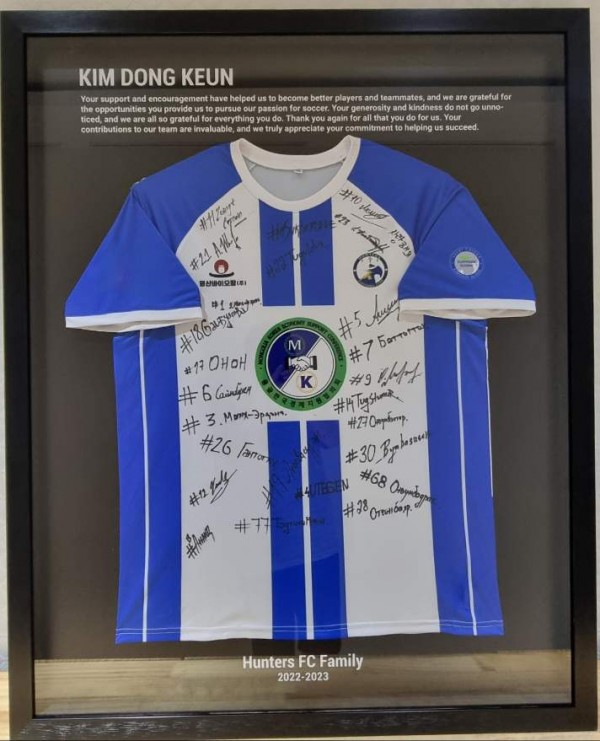 선수일동은 구단주 김동근 장로에게 “구단주님의 지원과 격려로 우리가 더 나은 선수와 동료가 되는 데 도움이 되었으며, 축구에 대한 열정을 추구할 수 있는 기회를 제공해 주셔서 감사합니다. 귀하의 관대함과 친절을 결코 간과할 수 없으며, 우리 모두는 베풀어 주신 모든 것에 감사드립니다. 우리를 위해 해주신 모든 일에 다시 한 번 감사드립니다. 우리 팀에 대한 귀하의 기여는 매우 소중하며 우리의 성공을 돕기 위한 귀하의 노력에 진심으로 감사드립니다. 2022-2023 헌터스 FC 가족”이라는 내용의 감사인사를 세기고 선수 개별 서명을 한 유니폼을 액자를 만들어 꽃다발과 함께 전달하고, “헌터스클럽의 오늘의 성공은 지난 11개월 동안 모든 훈련조건 제공과 필요한 모든 것을 도와주시고 우리를 위해 하나님께 기도해 주시고 모든 경기와 함께해 주신 마음과 도움과 지원으로 헌터스클럽이 몽골 축구의 역사적인 성공을 이루었다. 헌터스클럽의 구단주 김동근 장로님과 몽기총과 응원해주시는 모든 분들께 진심으로 감사드리다”고 인사했다.