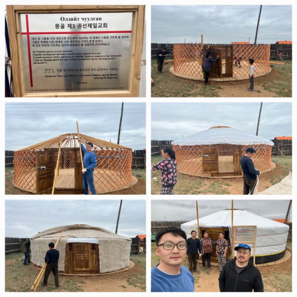 수원 권선제일교회(담임 이종찬 목사)가 몽골기독교총연합선교회(법인회장 김동근 장로)와 함께 몽골 아르항가이 아이막 울지트솜, 볼강아이막 호딱 운드르솜, 볼강 아이막 보고트 솜에 각각 게르성전을 건축했다.
