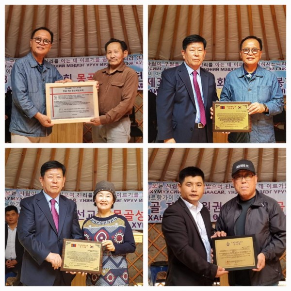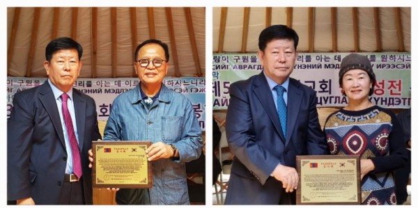 몽기총 김동근 장로는 몽골 복음화를 위한 몽기총의 사역에 적극 동참하여 몽골 제3.4 5수원권선제일교회 게르성전을 건축 후원한 한국 수원 권선제일교회 이종찬 담임목사와 김종승 안수집사, 최수연 권사에게 감사패를 전달하고, 각 교회에 몽기총에서 직접 제작한 강대상(최정임 님 후원), 강단, 간판을 전달했다.