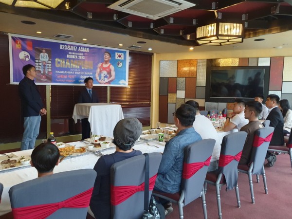 헌터스 클럽 지도목사인 몽골복음주의협회 알탄쳐지 목사의 기도로 시작된 이날 행사에서 헌터스 클럽 회장 김동근 장로는 “몽골 국내 대회에서 1등으로 이번 2023 바쉬케크 U20 &U17아시안 챔피언쉽 출전권을 확보했다는 소식에 다 같이 기뻐했었다. 대회 참가를 위해 키르키즈스탄으로 떠나기 며칠 전 바트빌궁선수를 만났는데, 긴장한 선수에게 잘할 수 있다는 믿음을 갖고 잘하고 오라는 응원과 기도해줬다. 한국에서도 몽골 어디에서도 헌터스 축구 매 경기를 보듯이, 아시안 챔피언십 예선과 준결승전, 결승전 경기를 지켜봤다. 아주 잘했다”고 칭찬했다.