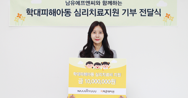 국제개발협력 NGO지파운데이션(대표 박충관)은 ㈜남유에프엔씨(대표 남유숙)이 학대피해 아동들의 심리치료 지원을 위해 후원금 1,000만 원을 기부 했다고 19일 밝혔다.