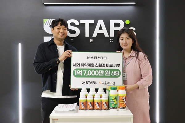 국제개발협력NGO 지파운데이션(대표 박충관)은 ㈜스타스테크(대표 양승찬)로부터 해외 농산물 재배 강화를 위해 1억 7,000만 원 상당의 액상비료를 기부 받았다고 6일 밝혔다.