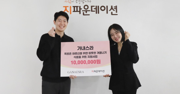 지파운데이션(대표 박충관)은 ㈜가내스라(대표 정슬아)가 쪽방촌 어르신들이 따뜻한 겨울을 보낼 수 있도록 후원금 1,000만 원을 지파운데이션에 전달했다고 23일 밝혔다.