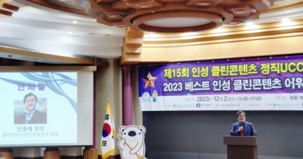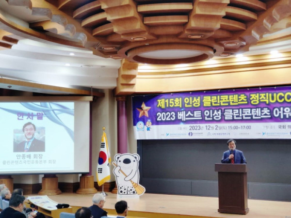 15년째 본 공모전과 시상식을 총괄하고 있는 안종배 클린콘텐츠국민운동본부 회장은 인사말에서 “우리 사회는 거짓된 사회와 정직한 사회의 갈림길, 또 인공지능의 노예 혹은 주인이 되는 갈림길에 서 있다. 인류의 미래는 현재 우리의 선택에 달려 있다”며 “오늘 수상 하는 여러분의 UCC가 세상을 정직하게 하고 챗GPT 인공지능을 선용하되 인류가 주체가 되도록 선한 영향력을 끼치게 되어 미래 사회를 인류가 행복하게 만들어가는데 크게 기여하게 될 것이다. 오늘 수상하시는 모든 분들께 축하와 감사를 드린다”고 말했다.