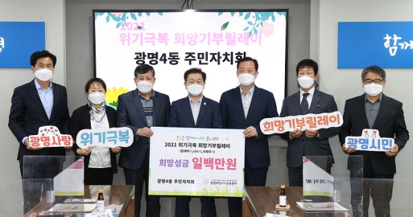 광명4동주민자치회(자치회장 장상화)는 9일 희망성금 100만원을 광명시사회복지협의회(회장 이상재)-광명희망나기운동본부에 전달하였다.
