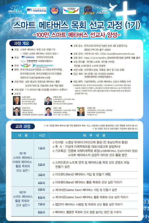 이번 교육은 스마트메타버스선교아카데미(안종배 원장)가 지난 1년간 준비한 메타버스를 목회와 선교 및 다음세대 교육 현장에서 활용할 수 있는 실전적인 방법을 익히는 과정으로 국내 최초로 4월 25일, 한국교회100주년 기념관 본관4층 믿음연수실에서 8시간 종일 과정으로 실시된다.