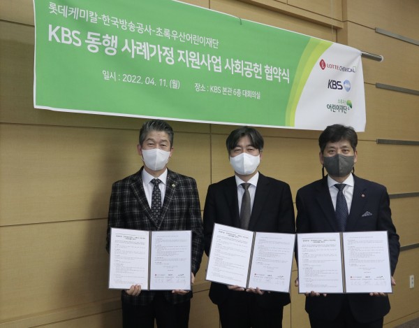 아동옹호대표기관 초록우산어린이재단(회장 이제훈)은 롯데케미칼(대표이사 김교현), 한국방송공사(사장 김의철)과 11일 KBS 본관 6층 대회의실에서 ‘KBS 동행 사례가정 지원사업 사회공헌활동 협약식’을 진행했다.