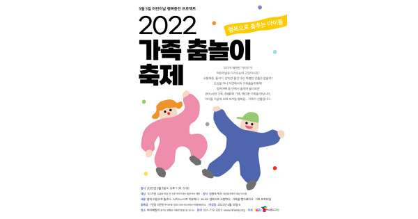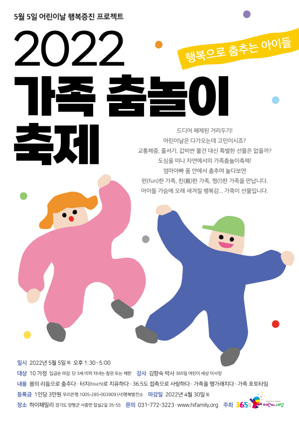 ‘365일 어린이 세상’(이사장. 김향숙)은 거리두기 해제 후 첫 어린이날을 맞이하여 어린이 행복증진 프로젝트인 “2022 가족춤놀이 축제 - 행복으로 춤추는 아이들”을 5월 5일(목) 오후 1시부터 5시까지 양평 하이패밀리 본부에서 개최한다.