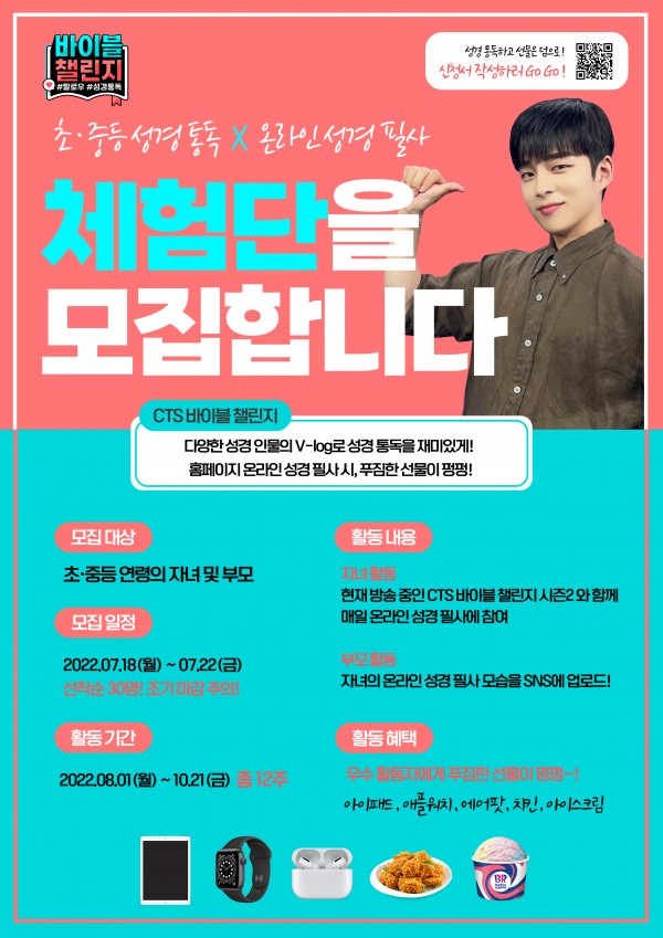 다음세대를 복음으로 회복시키기 위해 다양한 차세대 프로그램을 제작하고 있는 CTS기독교TV(회장 감경철, 이하 CTS)는 어린이 성경 통독 프로그램 ‘바이블 챌린지(CP 허명환, 이하 바챌)’에서 초·중등 연령의 자녀와 부모가 함께하는 온라인 성경 필사 체험단 모집을 내달 22일까지 진행하고 있다.