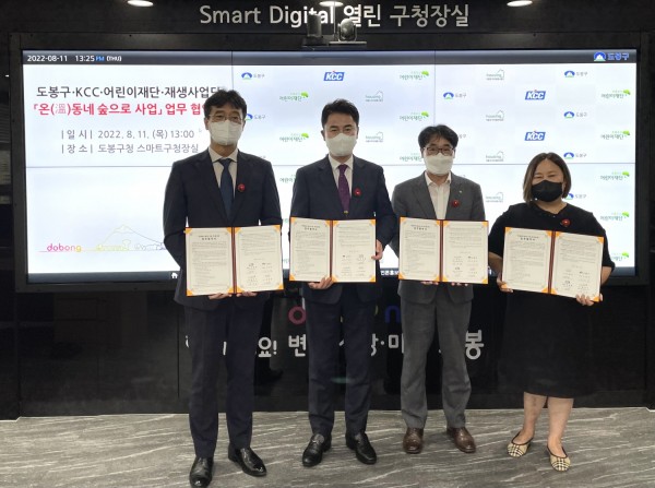 이번 협약을 통해 2018년부터 5년간 이어온 ‘온(溫)동네 숲으로’의 5번째 대상지인 도봉구 안골마을의 주거환경을 개선하고 마을공동체 활성화를 지원하기로 했다. 이날 협약식에는 오언석 도봉구청장, 김상준 KCC 상무, 박수봉 초록우산어린이재단 서울3지역본부장, 인향봉 저층주거지 재생사업단장이 참석했다.