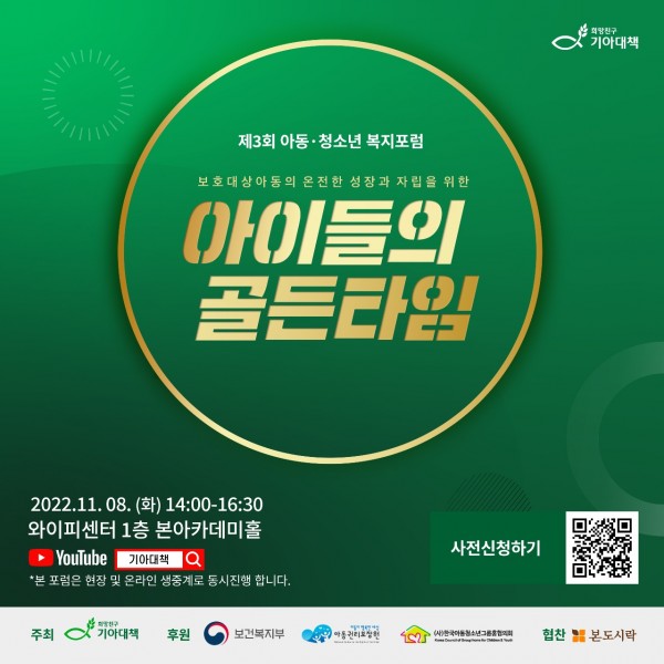 이번 포럼은 ‘보호대상아동의 온전한 성장과 자립을 위한 아이들의 골든타임’을 주제로 8일 오후2시 서울 와이피센터 1층 본 아카데미홀에서 진행된다. 포럼에서는 아동복지분야 각계 전문가들과 함께 보호대상아동이 겪는 생애 취약성을 깊이 들여다보고 현실적 개선 방안과 우리 사회가 나아가야 할 방향을 모색할 예정이다. 행사의 참여는 현장 방문 및 기아대책 공식 유튜브 채널을 통해 가능하다.