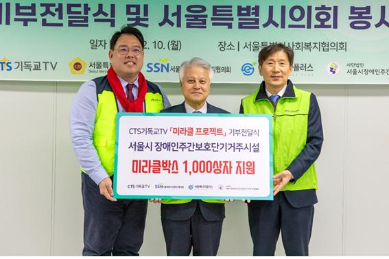 CTS기독교TV(이하 CTS, 회장 감경철)가 지난 10일 서울특별시사회복지협의회에서 서울시 취약 계층을 위한 「7000미라클 박스 기부 전달식」을 진행했다. 이날 기부전달식에는 CTS 최현탁 사장과 서울특별시의회 이성배 의원, 서울특별시사회복지협의회 김현훈 회장 등이 참석했다.