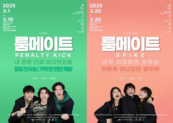 남성 자취생들의 이야기를 담은 ‘룸메이트 : 페널티킥’은 3월 1일부터 16일까지, 여성 자취생들의 이야기를 그린 ‘룸메이트 : 스파이크’는 3월 20일부터 30일까지 어댑터씨어터 1관에서 공연된다. 이번 공연은 지난해에 이어 어댑터씨어터와 극단아이컨택의 공동기획으로, 한국문화예술위원회의 공연예술 창작주체 및 창작공간 지원을 받아 제작되었다. 특히 '룸메이트' 시리즈는 2024년 부산국제공연예술마켓(BPAM) 쇼케이스 선정작으로 주목받았으며, 영국 웨스트엔드 제작사와 대본 라이선스 계약을 체결하여 현지화에도 도전하고 있다.