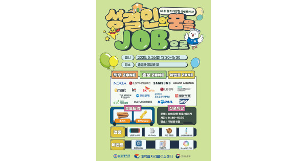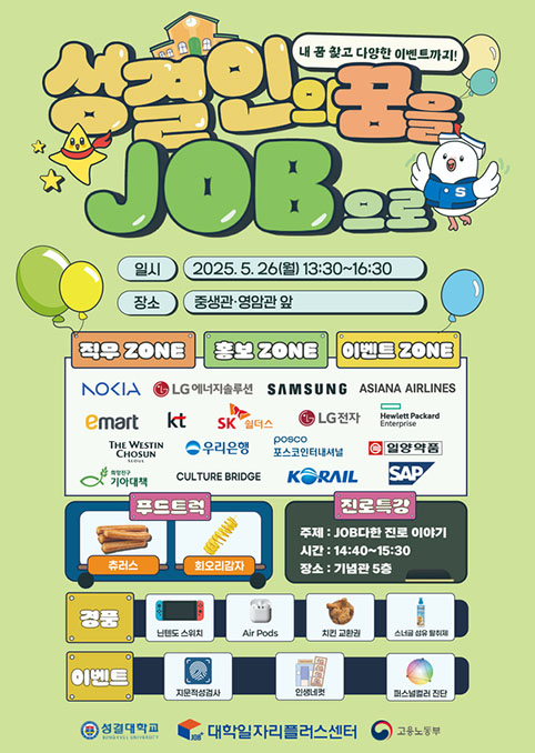 성결대학교(총장 정희석) 대학일자리플러스센터(센터장 김용규)가 오는26일 오후 1시 30분부터 4시 30분까지 성결대학교 중생관과 영암관 앞 야외 공간에서 재학생과 졸업생, 지역청년을 대상으로 ‘2025 성결인의 꿈을 JOB으로’ 직무박람회를 개최한다.
