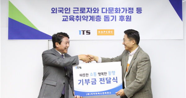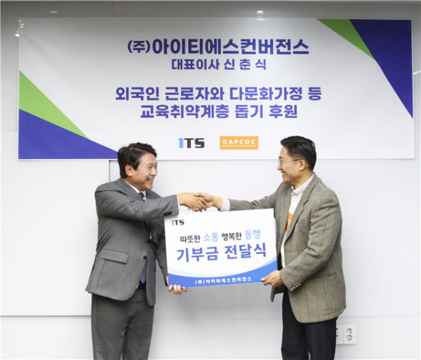 ㈜아이티에스컨버젼스(대표이사 신춘식)는 최근 (사)대학을위한마약중독예방재활센터(이하 답콕. DAPCOC Drug Addiction Prevention-Rehabilitation Center On the Campus. 이사장 두상달)에 외국인근로자·다문화가정 등 교육 취약계층 지원과 마약류 중독 예방 활동을 위해 후원금을 전달했다. 이번 기부는 단순한 물질적 나눔을 넘어, 사회 문제 해결에 기업이 직접 참여하겠다는 실천 의지를 담고 있다.