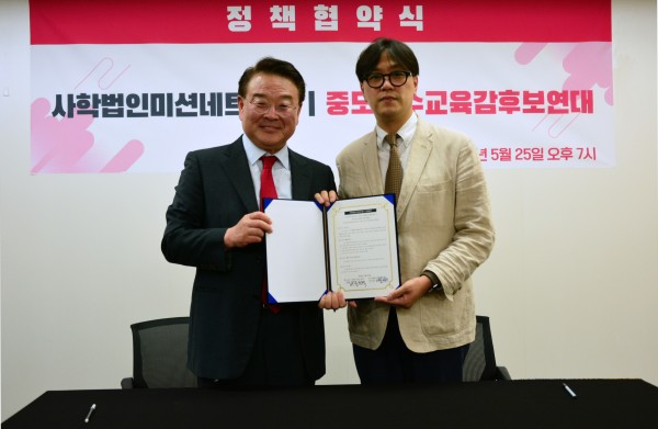 전국 468개 기독교 사학을 대표하는 사학법인 미션네트워크(이사장 이재훈, 사무총장 함승수)가 전국 11개 시도 중도보수 교육감 대표 후보들이 함께하는 ‘중도보수교육감후보연대’와 정책협약을 맺고, 왜곡된 교육 문화 개선을 위해 함께 노력할 것을 약속했다.