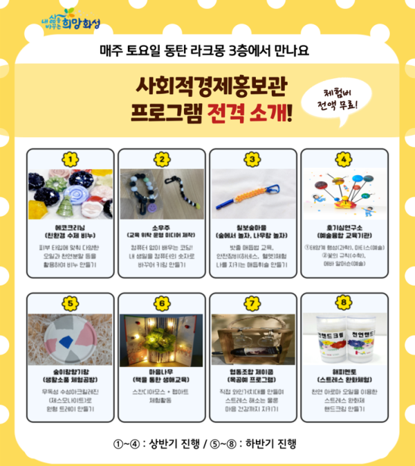 이번 프로그램은 화성시 내 사회적경제기업 중 8개 기업이 선정돼 진행하는 체험프로그램으로 사회적 경제의 의미를 시민들에게 알리기 위해 화성시가 주최하고 화성시사회적경제지원센터, 호기심연구소협동조합 주관으로 진행된다.