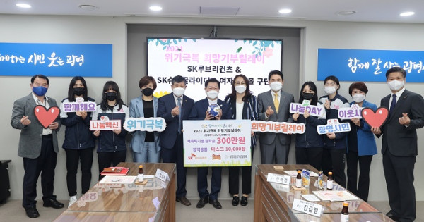 SK루브리컨츠(대표이사 차규탁), SK슈가글라이더즈(단장 이배현)은 14일 장학금 300만원과 희망성품 마스크 10,000장을 광명시사회복지협의회(회장 이상재)-광명희망나기운동본부에 전달하였다.