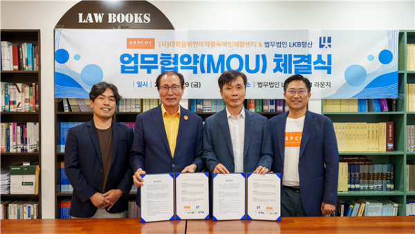 (사)대학을위한마약중독예방재활센터 (이하 답콕. DAPCOC Drug Addiction Prevention-Rehabilitation Center On the Campus. 이사장 두상달)에서 최근 서울 서초구 소재 법무법인 LKB평산 B1 라운지에서 「법무법인 LKB평산」과의 업무협약식이 진행됐다.