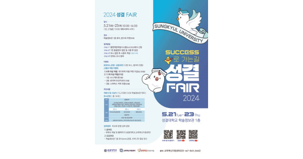 성결대학교(www.sungkyul.ac.kr, 총장: 김상식) 지난 21일부터 23일까지 성결대 학술정보관 1층 로비 및 야외 분수대 주변에서 성결대 교과·비교과 교육과정 홍보 및 성과공유, 지역사회 청년정책 안내를 통해 학생 참여 활성화를 도모하고자 재학생을 대상으로「SUCCESS로 가는 길, 성결 FAIR 2024」를 개최했다.
