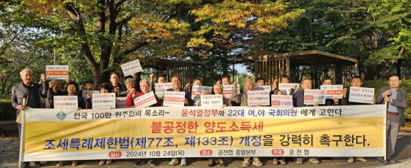 한편, 공전협 전국 91개 사업지구 주민대책위원회와 100만 주민, 토지주를 대표해 발표한 조세특례제한법 개정 필요성에 관한 공전협 입장문에서 정부와 국회는 “헌법의 정당 보상에 부합되도록 ①양도소득세 감면 확대를 위한 조세특례제한법 제77조의 개정, ②공익사업용 토지 등에 대한 양도소득세의 100% 감면을 위해서는 ‘양도소득세 종합한도 규정의 적용’을 배제하거나 적어도 대폭 증액토록 하는 것이 마땅하다”고 주장했다.