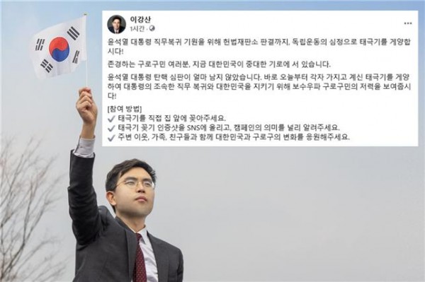 이 후보는 해당 게시물을 통해 “대통령 탄핵 심판이 얼마 남지 않았다”며, “바로 오늘부터 각자 가지고 계신 태극기를 게양하여 대통령의 조속한 직무 복귀와 대한민국을 지키기 위해 보수우파 구로구민의 저력을 보여주자”라고 제안했다.