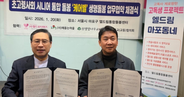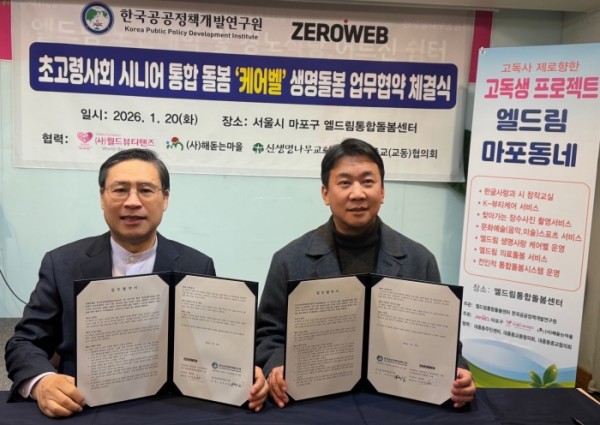 초저출생,초고령사회 생애 주기별 돌봄정책을 연구하는 한국공공정책개발연구원(원장 장헌일)과 디지털 라이프 케어 전문 주식회사 제로웹(대표이사 이재현)은 지난 20일 마포구 엘드림통합돌봄센터에서 ‘K-디지털돌봄’ 체계를 가동하고, 마포구 대흥동을 중심으로 한 ‘케어벨 생명돌봄’ 실증(PoC) 사업을 추진하기 위한 업무협약(MOU)을 체결했다고 밝혔다. 이번 협약은 고독사 예방을 넘어, 어르신이 살던 곳에서 지역 공동체와 지속적으로 연결되며 존엄한 일상을 이어갈 수 있도록 돌봄 공백을 줄이는 실행 모델을 구축하는 데 초점을 맞췄다.