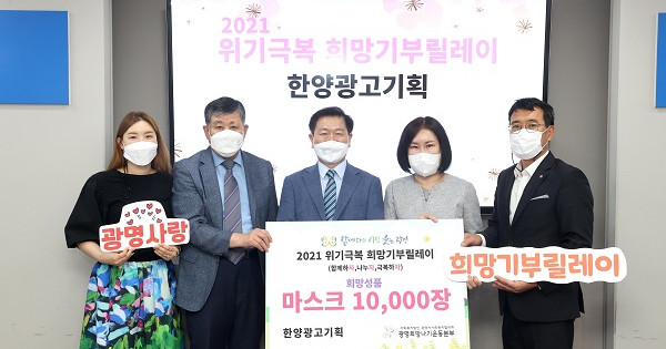 한양광고기획(대표 김영일)은 9일 2021 위기극복 희망기부릴레이 희망성품 마스크 10,000장을 광명시사회복지협의회(회장 이상재)-광명희망나기운동본부에 전달하였다.
