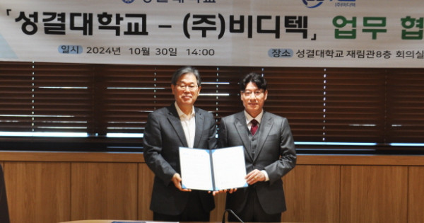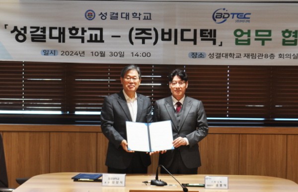 성결대학교(총장 김상식) 대학일자리플러스센터는 청년들의 취·창업 활성화를 위해 환경 IoT 전문 토털 기업인 ㈜비디텍(www.bdtec.co.kr, 대표: 최봉덕)과 10월 30일(수) 오후 2시, 성결대학교 재림관 8층 회의실에서 산학협력 MOU를 체결했다.