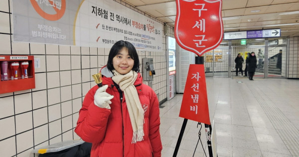 안지민 청년(구세군영천교회, 감신대 신학부 1학년)이 21일 서대문역에서 구세군 자선냄비 봉사활동을 하며 사랑을 전하고 있다 .