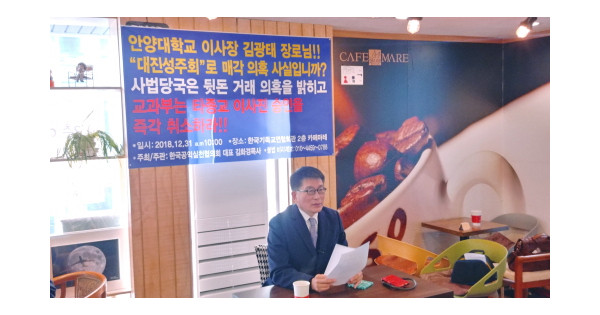한국기독교연합회관 2층에서 열린 기자회견에서 김화경 대표는 “정부는 2018년 11월 사학비리를 적폐청산의 대상으로 규정하고 강력하게 대처한다고 발표했다”며 “그럼에도 한국교회 영성의 대가 전설로 불리는 고 김치선 박사(대한 신학교)가 설립한 안양 대학교가 대순진리회 성주방면에 매각 의혹의 제보를 받았다”고 말했다.