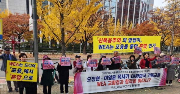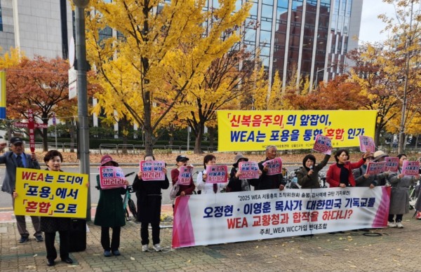 ‘WEA WCC 가입 반대조합’은 "WEA는 신복음주의의 앞잡이이다. 신복음주의는 복음주의가 아니다"라며 "오정현 이영훈 목사는 사퇴하고 서울총회 개최를 중단하라"고 촉구했다.