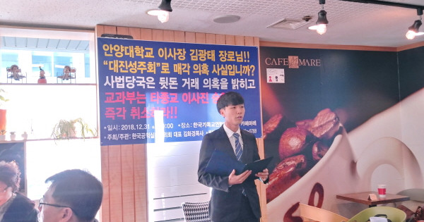 유현우 기자/안양대학교 신학대학 학생회(학생회장 왕현호)가 기독 사학을 대순진리회(이하 대진성주회)에 불법 매각한 것과 관련 “교육부와 정부당국은 특별 감사를 해 진상을 밝힐 것”을 골자로 한 성명서를 발표 했다.
